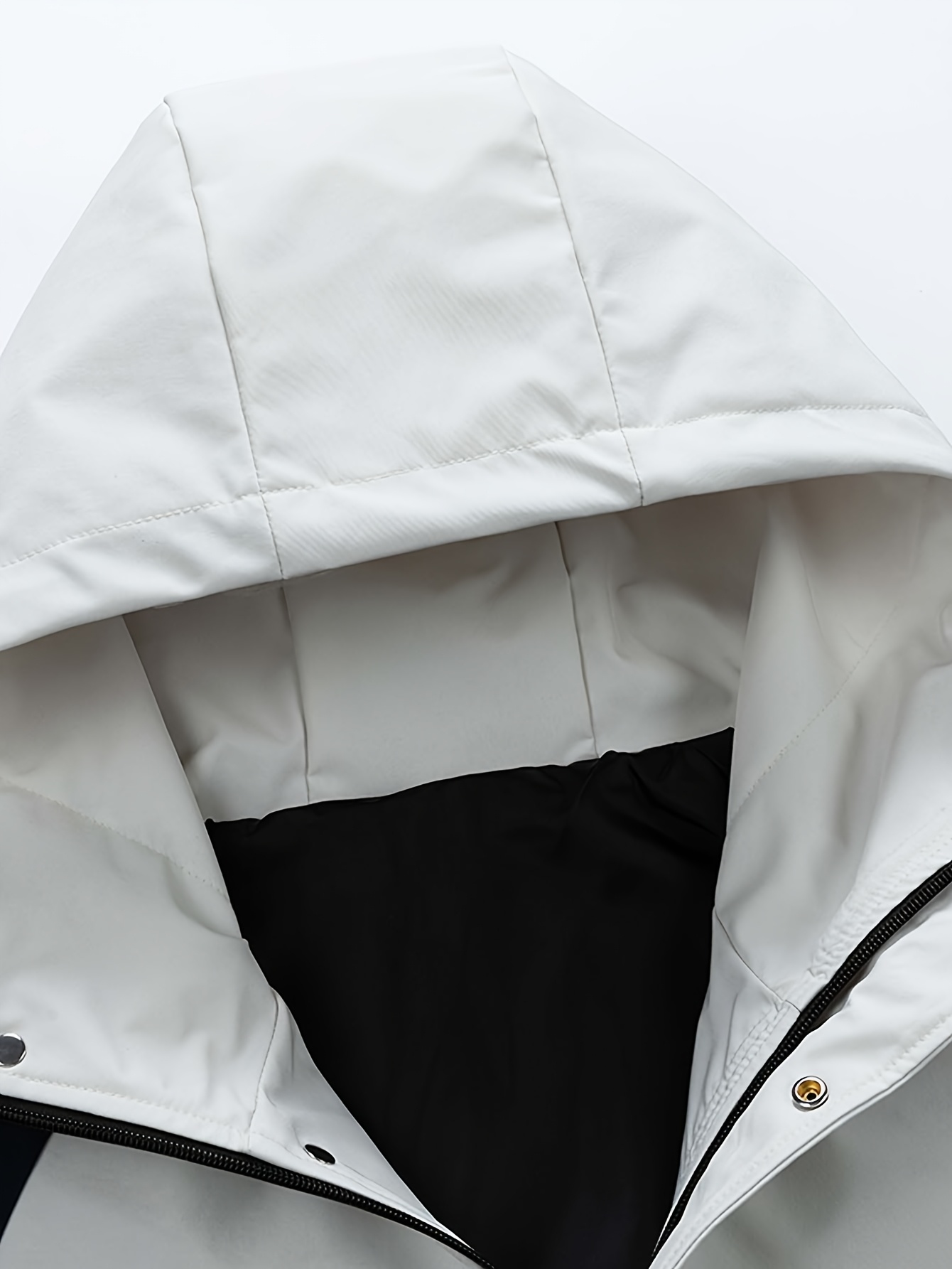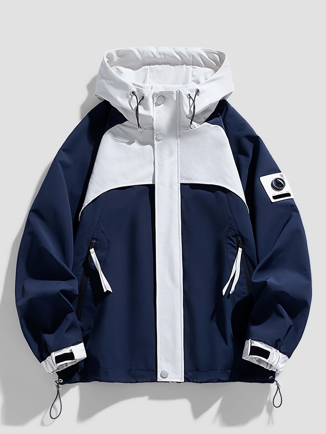 Men'S Hooded Windbreaker Jacket - Navy & White Color Block, Loose Fit with Zipper Pockets, Casual Outdoor Spring/Fall Coat for Casual Attire, Windbreaker Jacket, Spring Outerwear, Contrast Color Design, Durable Fabric