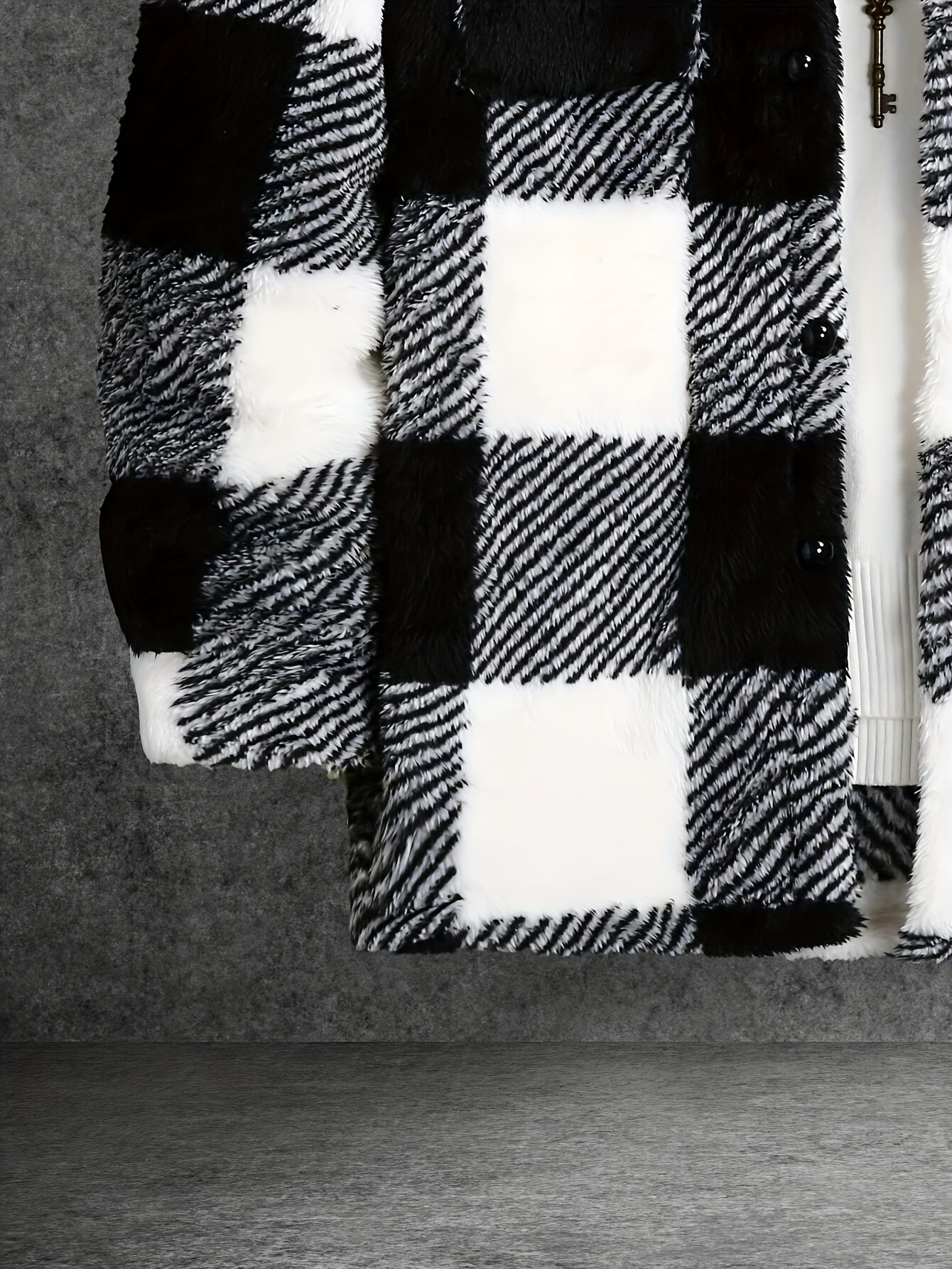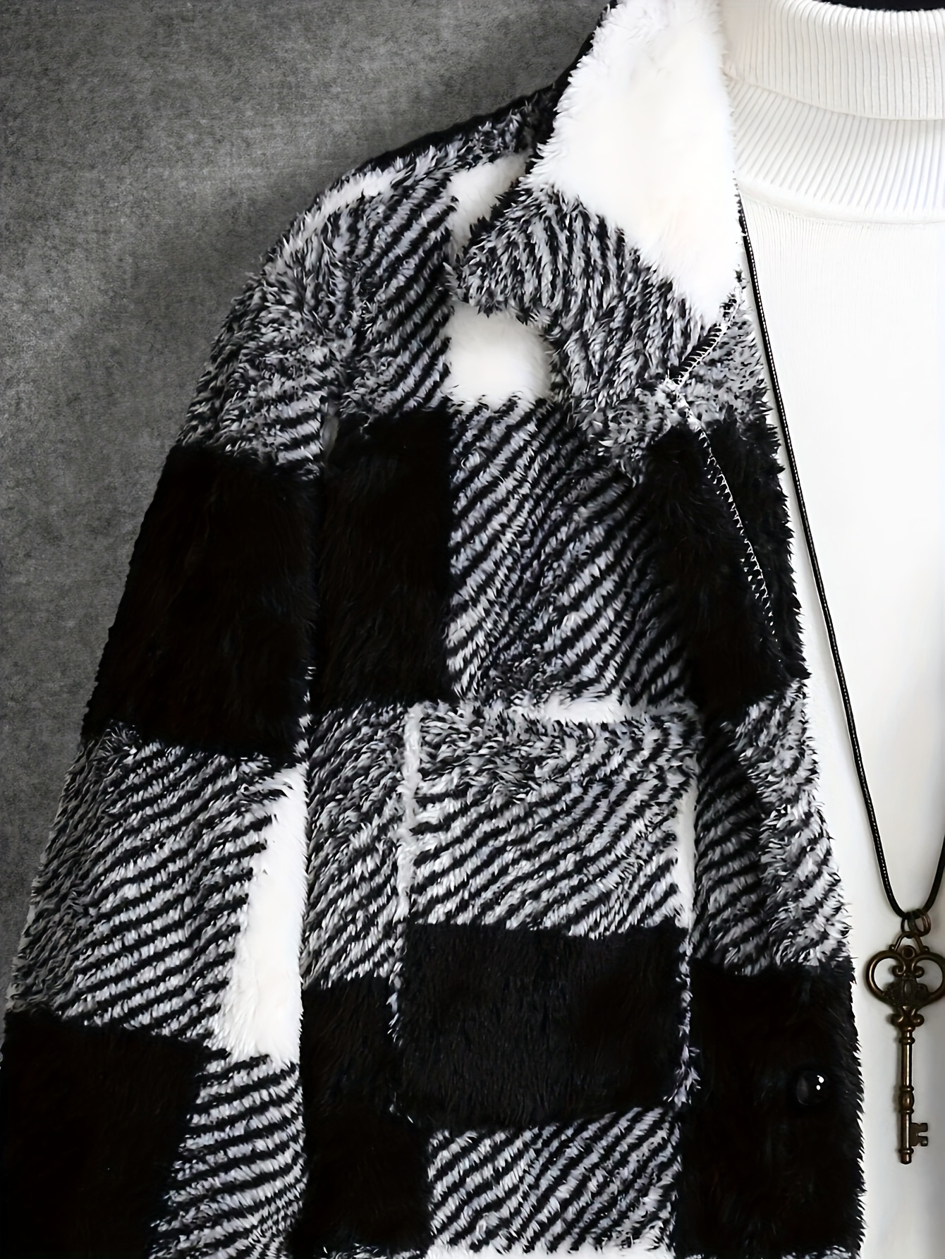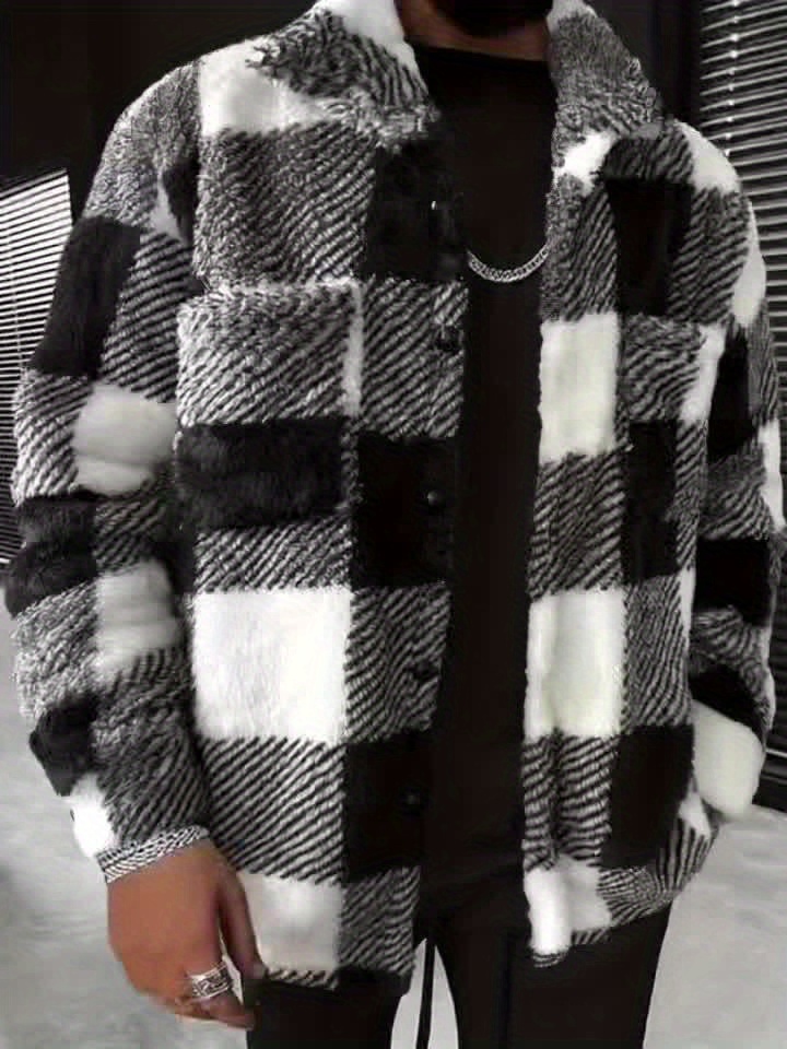 Men'S Cozy Plaid Fleece Jacket - Black & White Checkered Pattern, Loose Fit Winter Coat with Button Front, Long Sleeves, and Fluffy Lining for Fall/Winter, Winter Coat