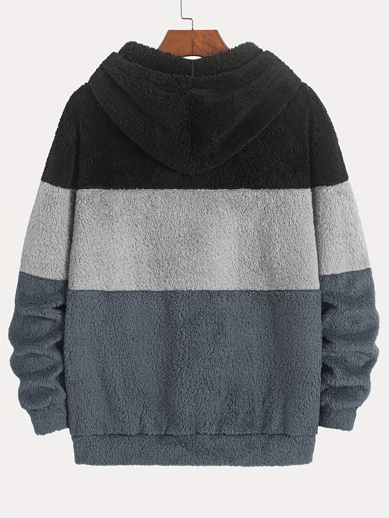 Men's Heavyweight Plush Hoodie - Winter Thermal Pullover Sweatshirt with Kangaroo Pocket, Dark Grey/Black Color Block Hooded Sweater for Cold Weather, Machine Washable Loose Fit Casual Outerwear, Ribbed Cuffs And Hem