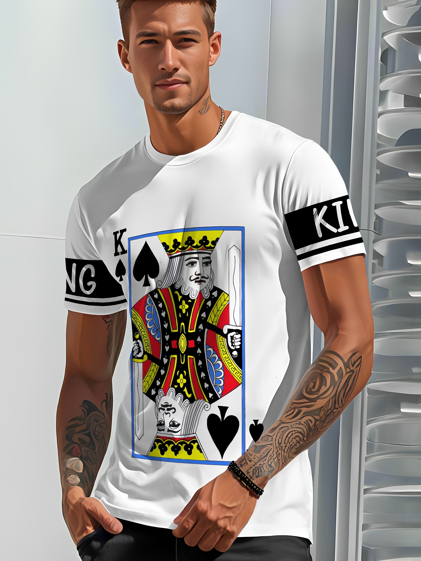 Men'S Royal King of Spades Graphic T-Shirt - White Casual Summer Tee with Black & White Crown Design, Short Sleeve, Round Neck, Polyester Blend, Perfect for Casual Attire & Parties, Party Fashion Top | Bold Print Tee | Stretchable Fabric, Knit