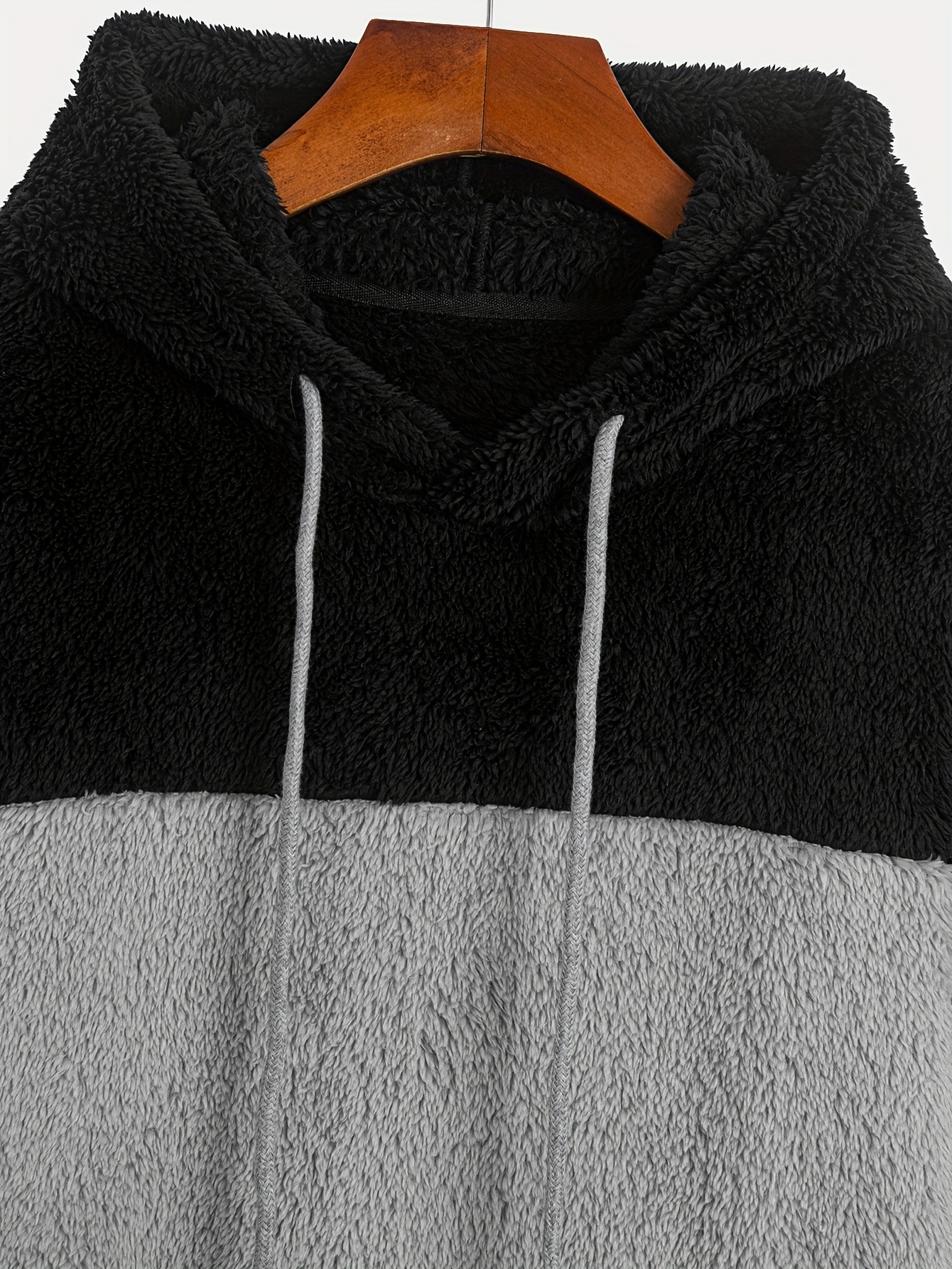 Men's Heavyweight Plush Hoodie - Winter Thermal Pullover Sweatshirt with Kangaroo Pocket, Dark Grey/Black Color Block Hooded Sweater for Cold Weather, Machine Washable Loose Fit Casual Outerwear, Ribbed Cuffs And Hem