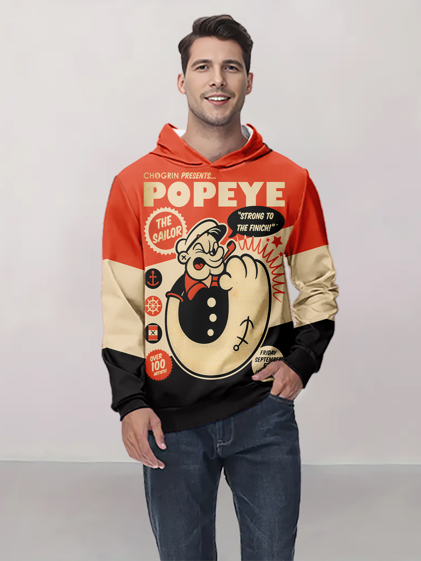 Men'S Popeye The Sailor Fresh Power 3D Print Hoodie - Casual Long Sleeve, Vibrant Orange & Black Graphic Pullover with "Strong to the Point" Design, Perfect for Spring/Fall, Novelty Hoodie