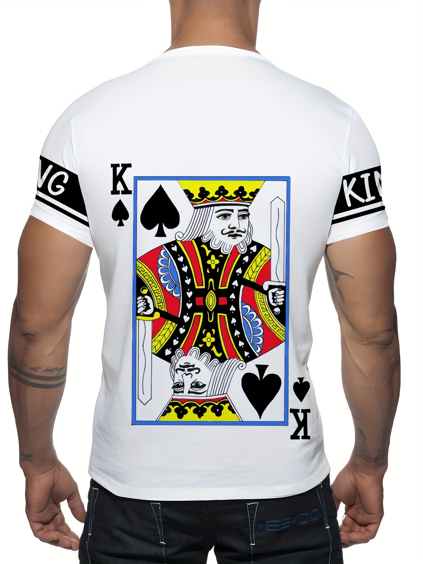 Men'S Royal King of Spades Graphic T-Shirt - White Casual Summer Tee with Black & White Crown Design, Short Sleeve, Round Neck, Polyester Blend, Perfect for Casual Attire & Parties, Party Fashion Top | Bold Print Tee | Stretchable Fabric, Knit
