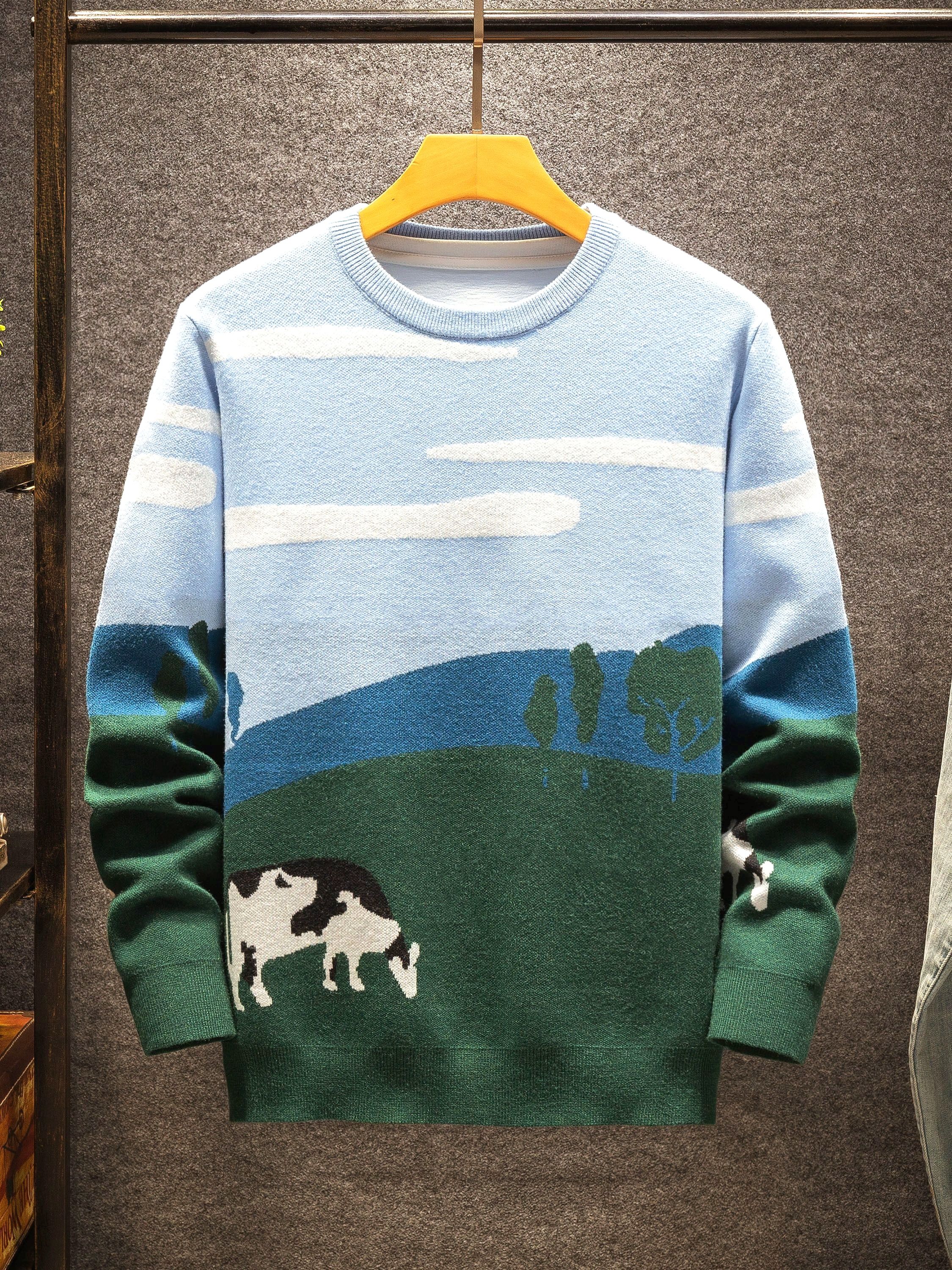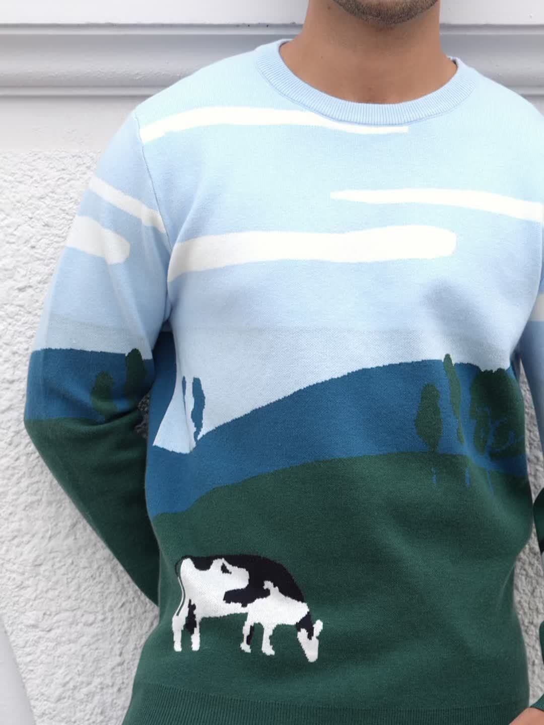 Cozy Fall | Cozy Fall Cow Print Sweater for Men - Casual Long Sleeve, Thick Knit, Acrylic, Crew Neck, Green & Blue Design with Black and White Cow, Perfect for Fall/Winter, Fall Winter Apparel | Playful Design | Acrylic Knitwear