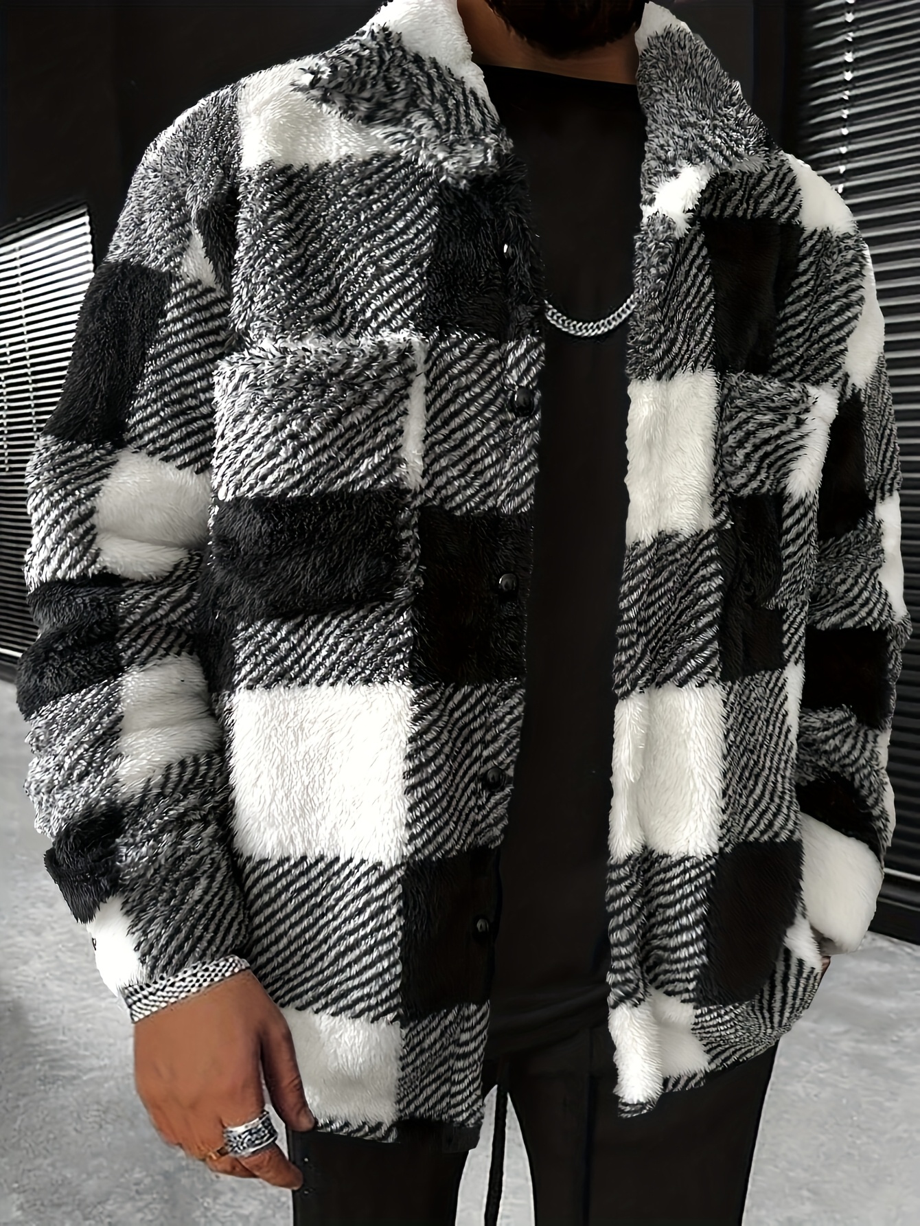 Men'S Cozy Plaid Fleece Jacket - Black & White Checkered Pattern, Loose Fit Winter Coat with Button Front, Long Sleeves, and Fluffy Lining for Fall/Winter, Winter Coat