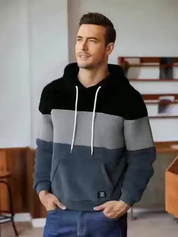 Men's Heavyweight Plush Hoodie - Winter Thermal Pullover Sweatshirt with Kangaroo Pocket, Dark Grey/Black Color Block Hooded Sweater for Cold Weather, Machine Washable Loose Fit Casual Outerwear, Ribbed Cuffs And Hem