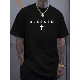 Men'S "Blessed" Cross Print T-Shirt - Casual Crew Neck, Short Sleeve, Lightweight Polyester, Summer Essential for Casual Attire, Everyday Tshirt | Trendy Casualwear | Comfortable Fit